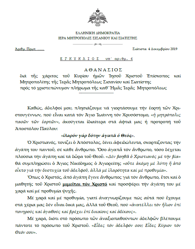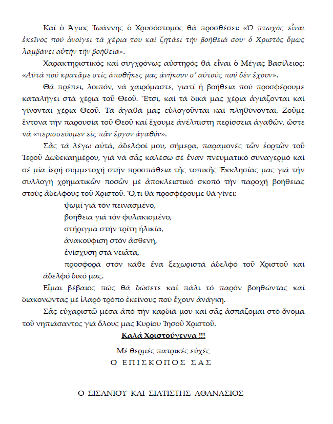 Ἐγκύκλιος τοῦ Σεβασμιωτάτου Μητροπολίτου Σισανίου καί Σιατίστης κ.κ. Ἀθανασίου γιά τόν Ἔρανο τῆς Ἀγάπης.