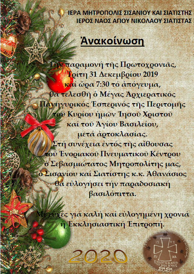 Μέγας Ἀρχιερατικός Ἑσπερινός τῆς Πρωτοχρονιᾶς στήν Ἐνορία τοῦ Ἁγίου Νικολάου καί κοπή βασιλόπιττας.