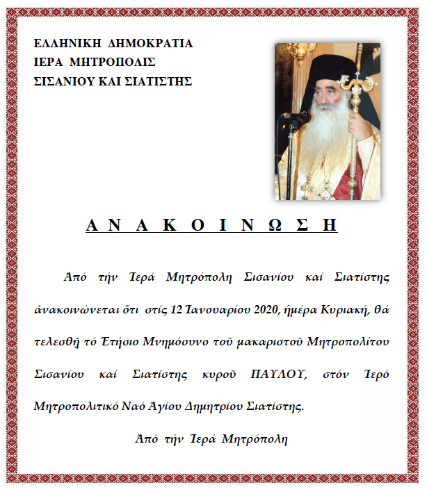 • Ἐγκύκλιος τοῦ Σεβασμιωτάτου Μητροπολίτου Σισανίου καί Σιατίστης κ.κ. Ἀθανασίου.