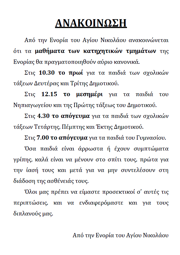Τα μαθήματα των κατηχητικών τμημάτων της Ενορίας του Αγίου Νικολάου.