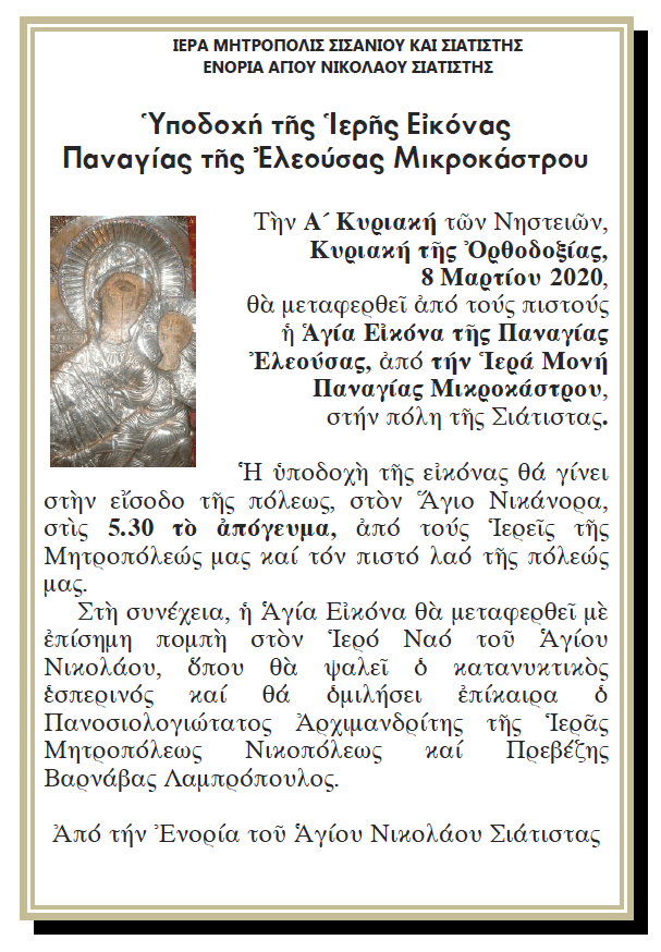 Ἡ Ἐνορία τοῦ Ἁγίου Νικολάου Σιάτιστας θά ὑποδεχθεῖ τήν Ἱερή Εἰκόνα τῆς Παναγίας τῆς Ἐλεούσας ἀπό τήν Ἱερά Μονή Μικροκάστρου.