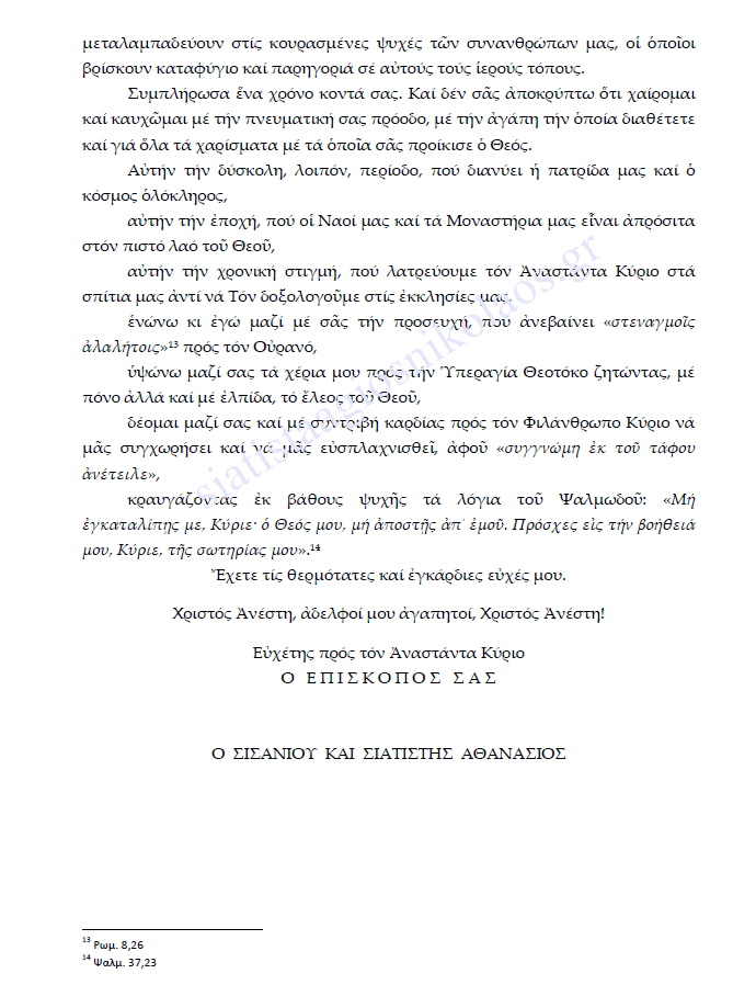 Ἐγκύκλιος ἐπί τῇ ἑορτῇ τῆς Ἀναστάσεως τοῦ Χριστοῦ τοῦ Σεβασμιωτάτου Μητροπολίτου Σισανίου καί Σιατίστης κ.κ. Ἀθανασίου.