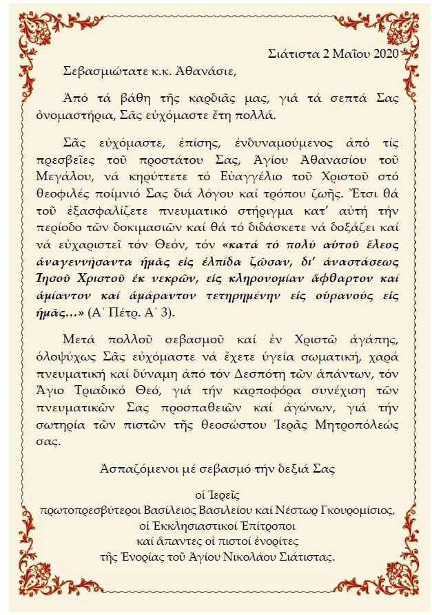 Εὐχές γιά τήν ὀνομαστική ἑορτή τοῦ Σεβασμιωτάτου Μητροπολίτου Σισανίου καί Σιατίστης κ.κ. Ἀθανασίου.