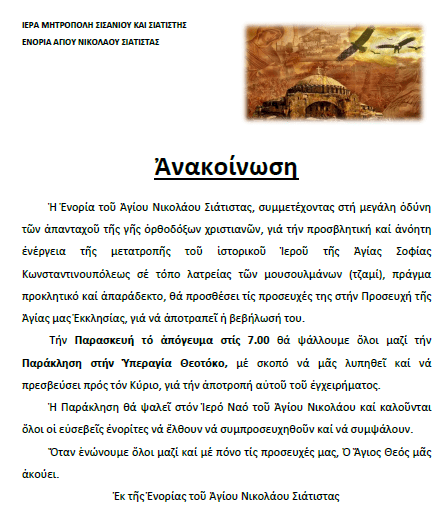 Παράκληση στήν Ὑπεραγία Θεοτόκο γιά τόν ἱστορικό Ἱερό Ναό τῆς Ἁγίας Σοφίας.
