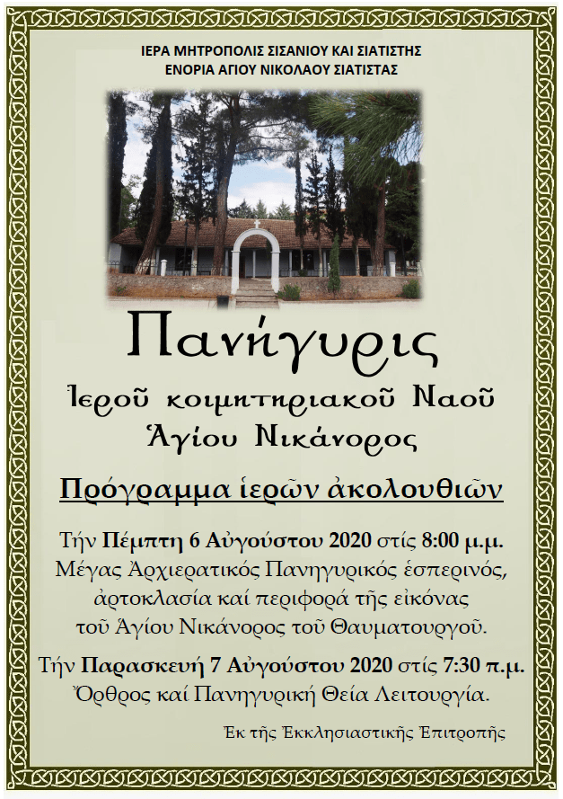 Πανήγυρις του κοιμητηριακού Ιερού Ναού Αγίου Νικάνορος στην ενορία του Αγίου Νικολάου Σιάτιστας.