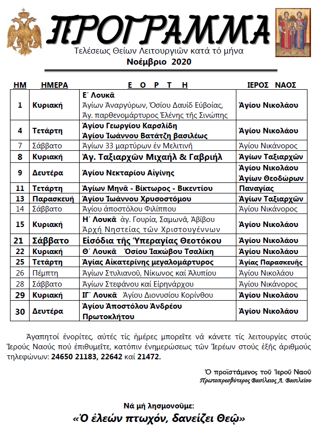 Πρόγραμμα Θείων Λειτουργιών Νοεμβρίου 2020