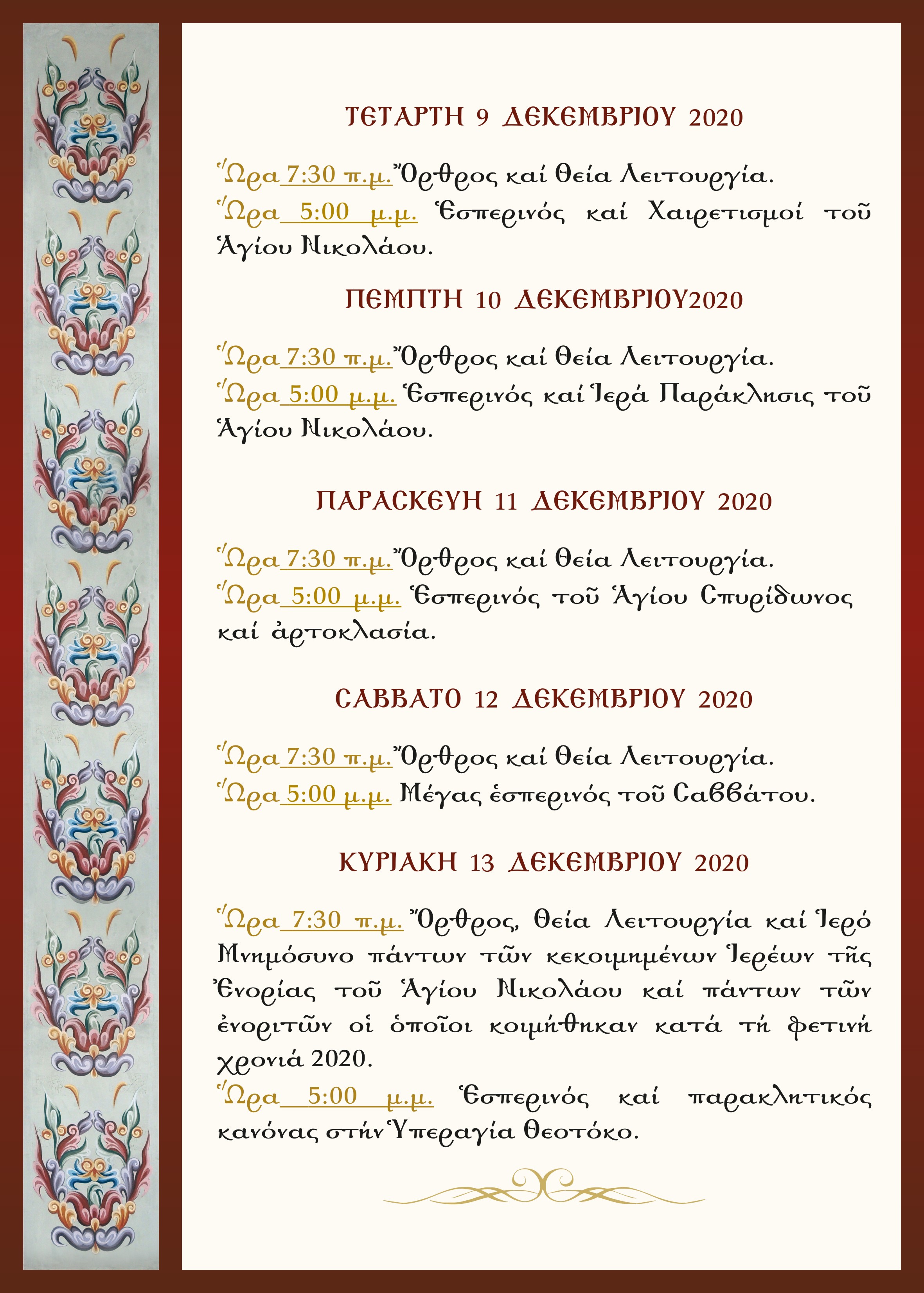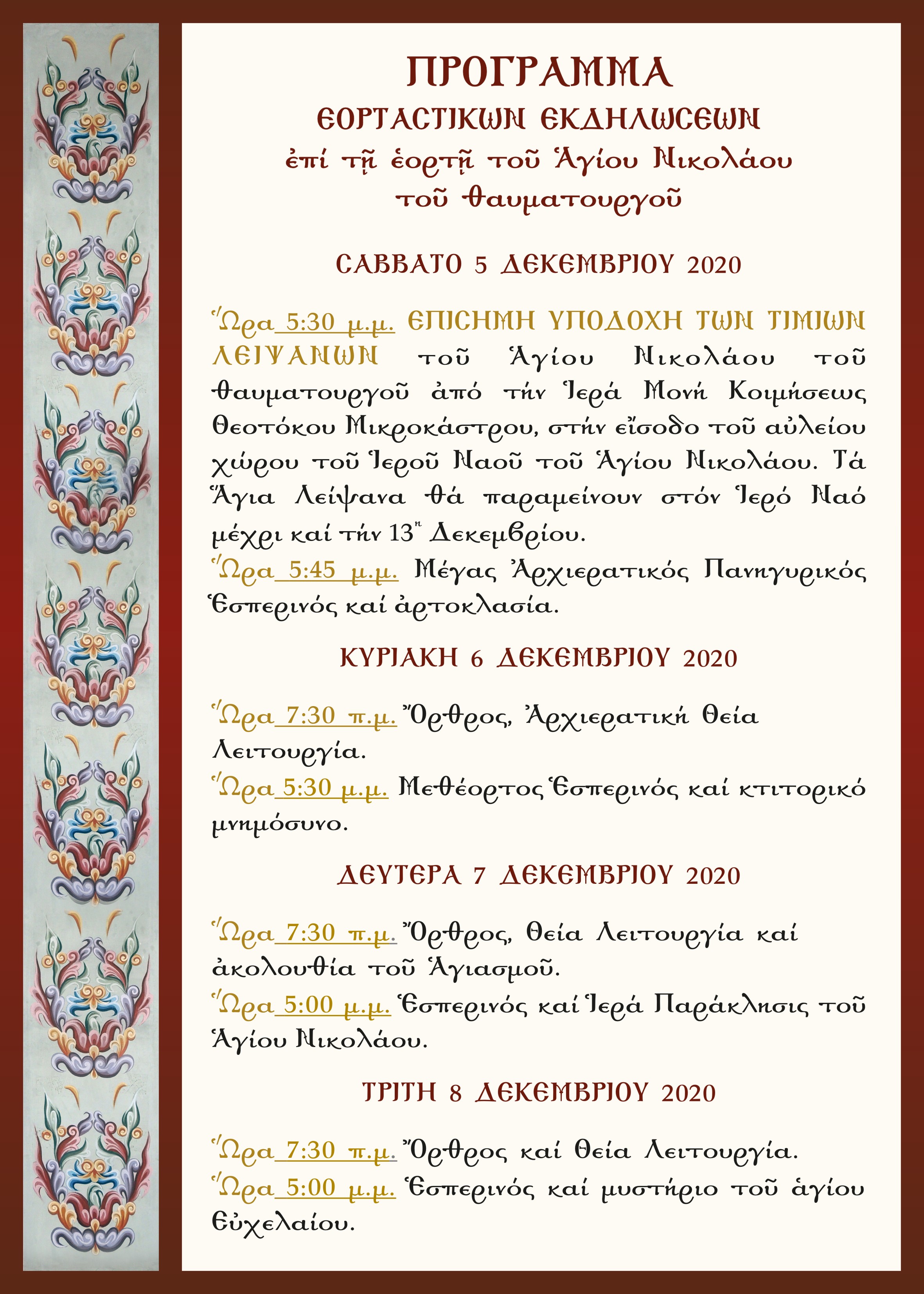 Ἑορτή Ἁγίου Νικολάου τοῦ θαυματουργοῦ. Πρόγραμμα ἐκκλησιαστικῶν ἀκολουθιῶν τῆς Ἐνορίας τοῦ Ἁγίου Νικολάου Σιάτιστας.