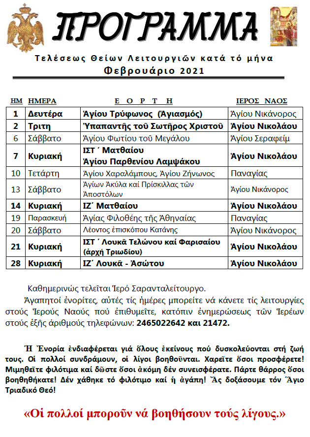 Πρόγραμμα Θείων Λειτουργιών Φεβρουαρίου 2021