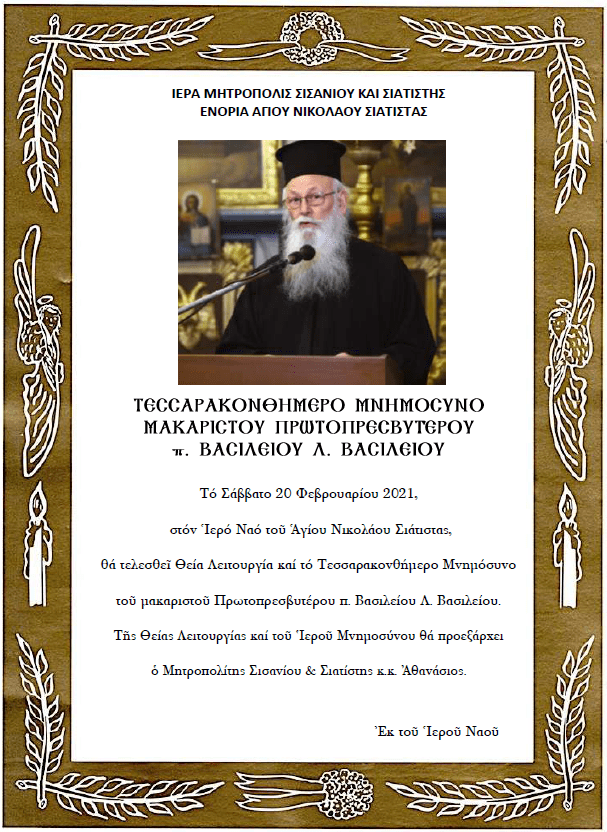 Ιερό τεσσαρακονθήμερο μνημόσυνο υπέρ αναπαύσεως της ψυχής του μακαριστού Πρωτοπρεσβυτέρου π. Βασιλείου Λ. Βασιλείου.