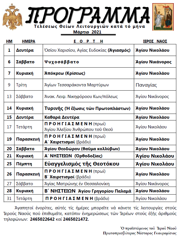 Πρόγραμμα Θείων Λειτουργιών Μαρτίου 2021
