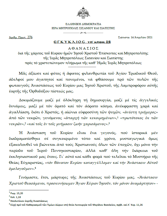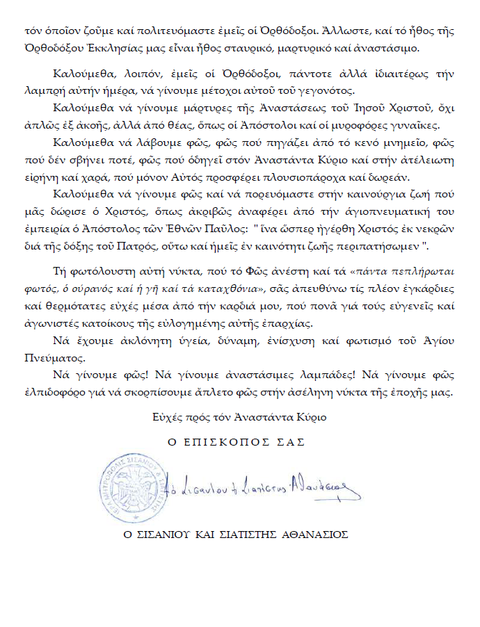 Ἐγκύκλιος ἐπί τῇ ἑορτῇ τῆς Ἀναστάσεως τοῦ Χριστοῦ τοῦ Σεβασμιωτάτου Μητροπολίτου Σισανίου καί Σιατίστης κ.κ. Ἀθανασίου.