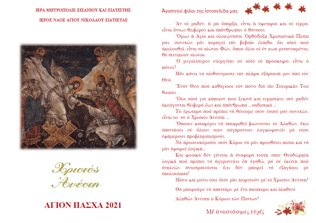 ← Ἐγκύκλιος ἐπί τῇ ἑορτῇ τῆς Ἀναστάσεως τοῦ Χριστοῦ τοῦ Σεβασμιωτάτου Μητροπολίτου Σισανίου καί Σιατίστης κ.κ. Ἀθανασίου.