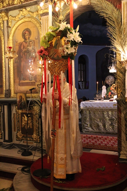 Η ανάγνωση του Ιερού Ευαγγελίου της Αναστάσεως και η χαρμόσυνη υμνωδία του «Χριστός ανέστη εκ νεκρών» έλαβαν χώρα στον στολισμένο προαύλιο του Ναού.