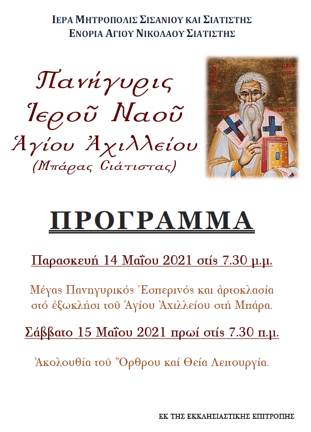 Πανήγυρις Ιερού Ναού Αγίου Αχιλλείου.
