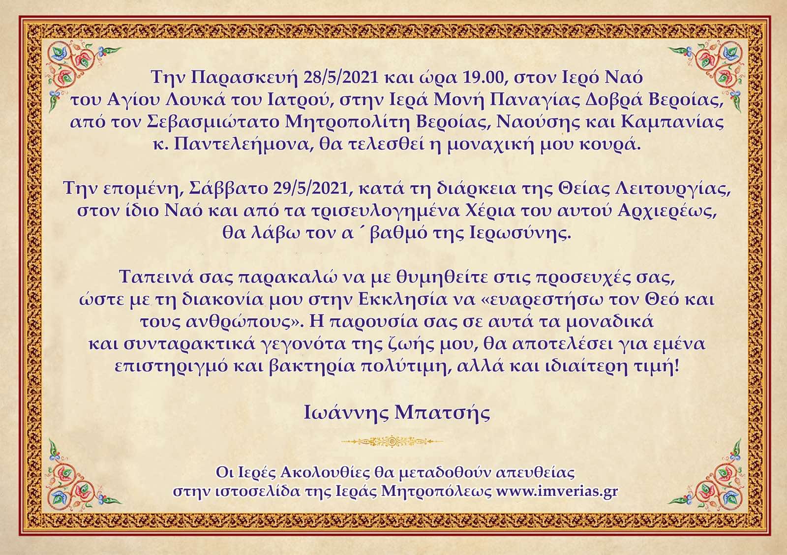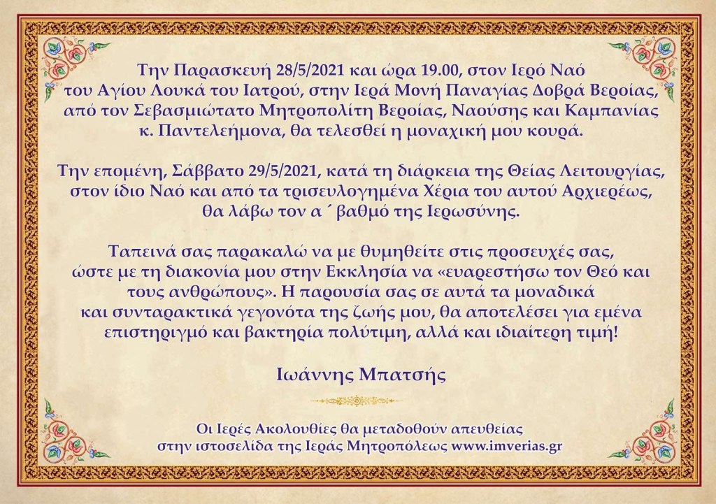 * Όποιος εκ των ενοριτών επιθυμεί να συμμετάσχει στην χαρά του Ιωάννου, θα πρέπει να μετακινηθεί με προσωπικό μέσον, καθότι οι υγειονομικές συνθήκες εξ αιτίας της πανδημίας, δεν επιτρέπουν να μετακινηθούμε με πούλμαν όλοι μαζί, όπως το επιθυμούσαμε.