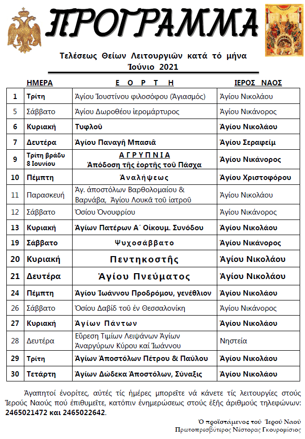 Πρόγραμμα Θείων Λειτουργιών Ιουνίου 2021
