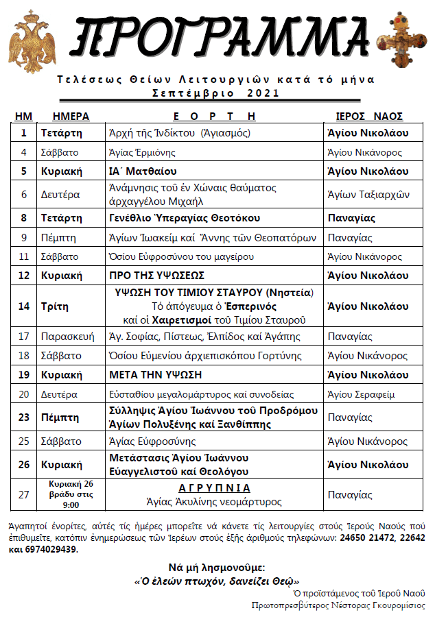 Πρόγραμμα Θείων Λειτουργιών Σεπτεμβρίου 2021