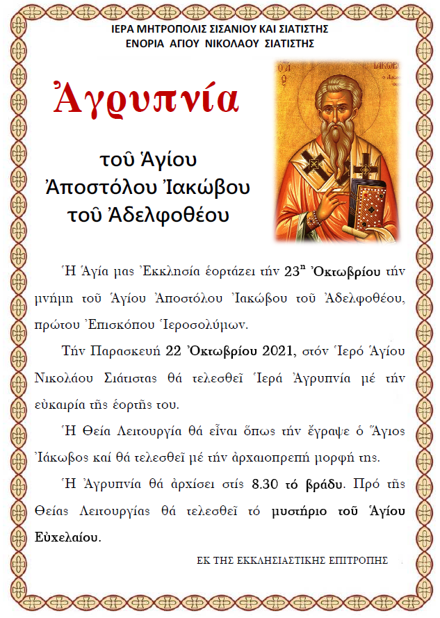 Ιερά Αγρυπνία και Θεία Λειτουργία του Αγίου Ιακώβου του Αδελφοθέου στην Ενορία του Αγίου Νικολάου Σιάτιστας.