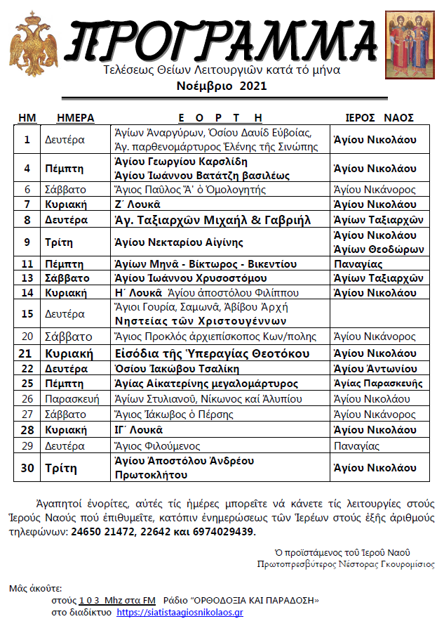 Πρόγραμμα Θείων Λειτουργιών Νοεμβρίου 2021