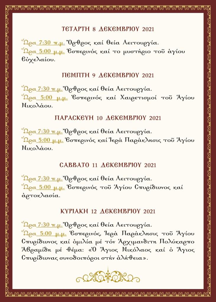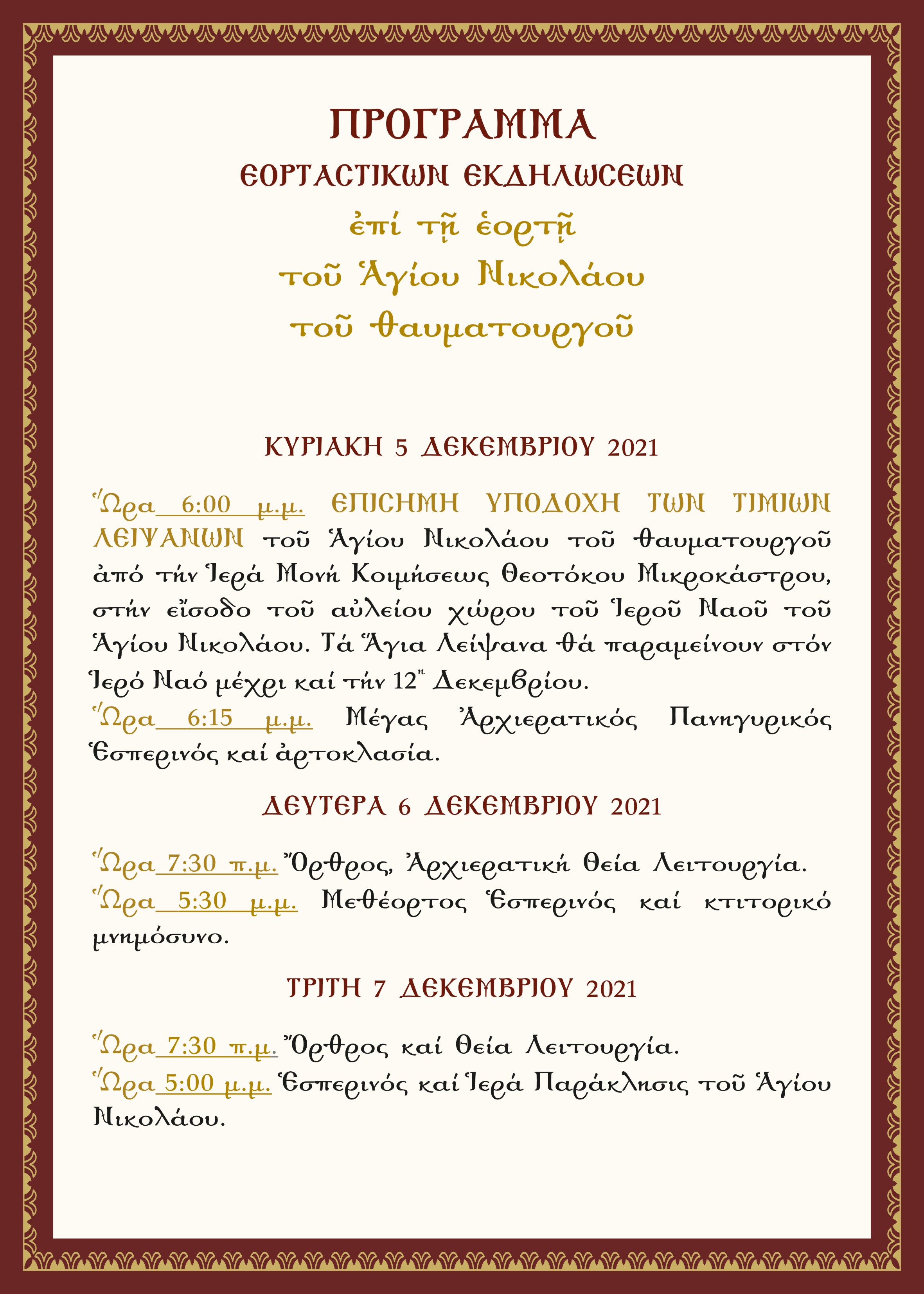 • Πρόγραμμα Ἑορταστικῶν Ἐκδηλώσεων ἐπὶ τη ἑορτὴ τοῦ Ἁγίου Νικολάου.