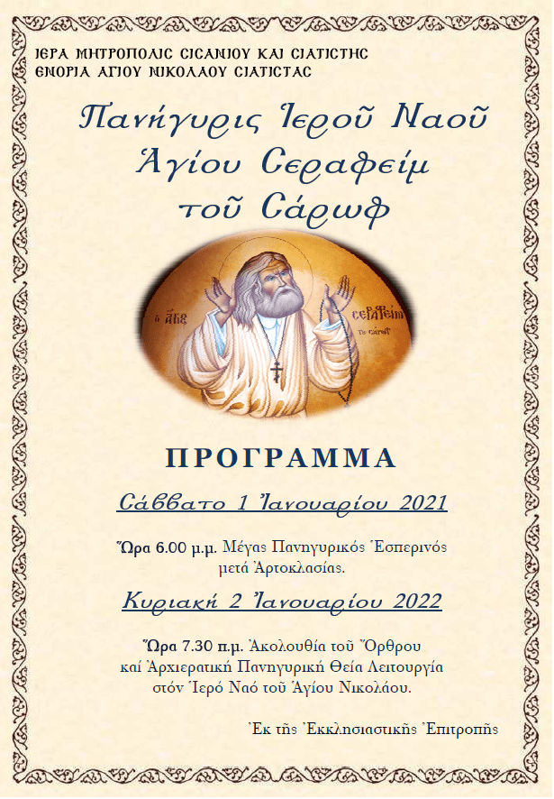 Πανήγυρις Ἱεροῦ Ναοῦ Ἁγίου Σεραφείμ τοῦ Σάρωφ.