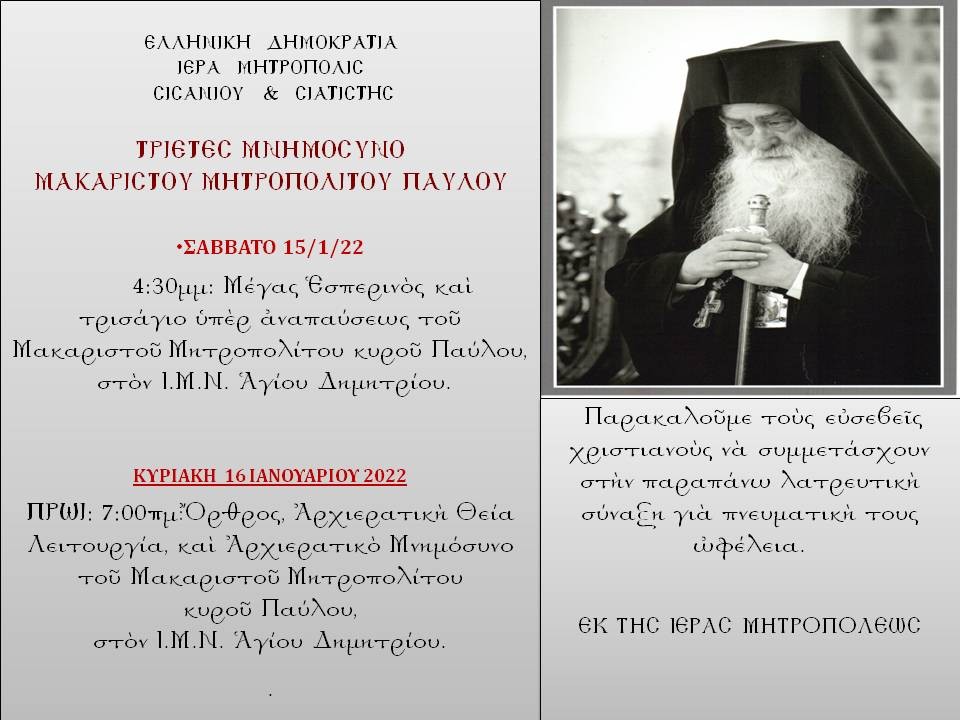 Τριετές Μνημόσυνο Μακαριστού Μητροπολίτου Παύλου