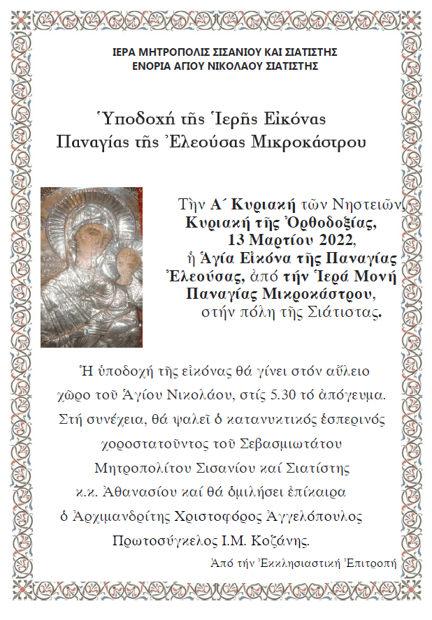 Ἡ Ἐνορία τοῦ Ἁγίου Νικολάου θά ὑποδεχθεῖ τήν Ἱερή Εἰκόνα τῆς Παναγίας τῆς Ἐλεούσας ἀπό τήν Ἱερά Μονή Μικροκάστρου.