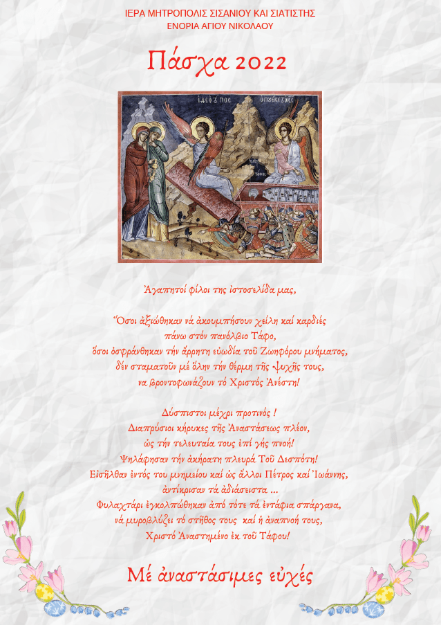 ← Ἐγκύκλιος ἐπί τῇ ἑορτῇ τῆς Ἀναστάσεως τοῦ Χριστοῦ τοῦ Σεβασμιωτάτου Μητροπολίτου Σισανίου καί Σιατίστης κ.κ. Ἀθανασίου.