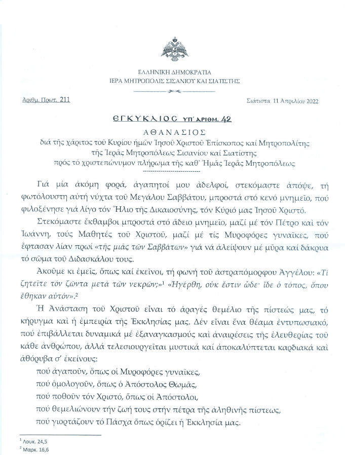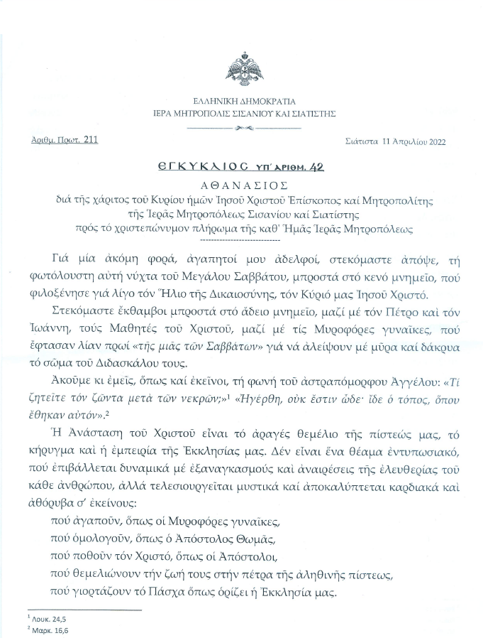 Ἐγκύκλιος ἐπί τῇ ἑορτῇ τῆς Ἀναστάσεως τοῦ Χριστοῦ τοῦ Σεβασμιωτάτου Μητροπολίτου Σισανίου καί Σιατίστης κ.κ. Ἀθανασίου.