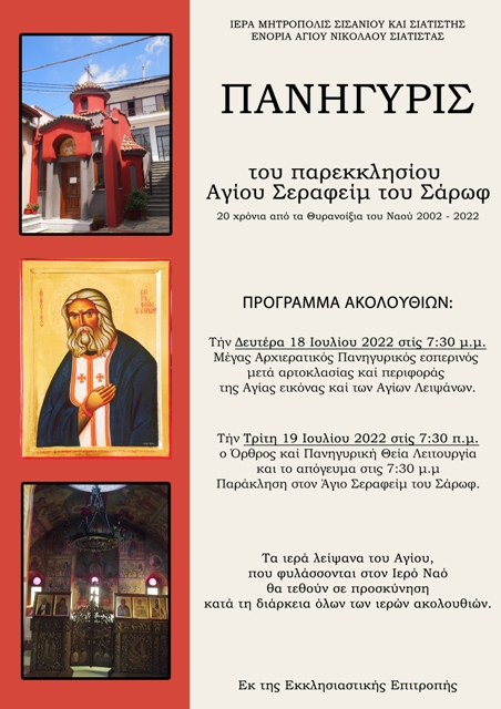 Πανηγυρίζει το Ιερό παρεκκλήσιο του Αγίου Σεραφείμ του Σάρωφ και τα 20 χρόνια από τα Θυρανοίξια του Ναού.