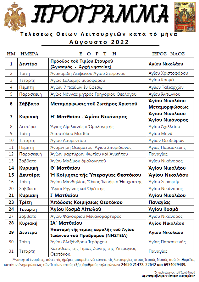 Πρόγραμμα Θείων Λειτουργιών Αυγούστου 2022