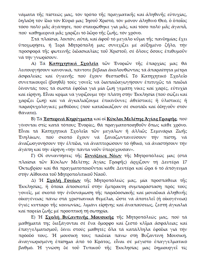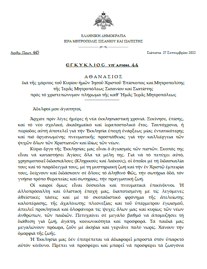 Ἐγκύκλιος τοῦ Σεβασμιωτάτου Μητροπολίτου Σισανίου καί Σιατίστης κ.κ. Ἀθανασίου, ἐπί τή ἐνάρξει τῶν κατηχητικῶν μαθημάτων. (2022 – 2023)