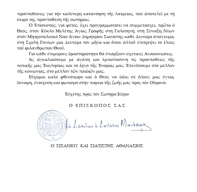 • Ἐγκύκλιος τοῦ Σεβασμιωτάτου Μητροπολίτου Σισανίου καί Σιατίστης κ.κ. Ἀθανασίου.