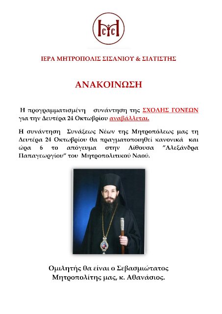 Αναβολή ενάρξεως Σχολής Γονέων.