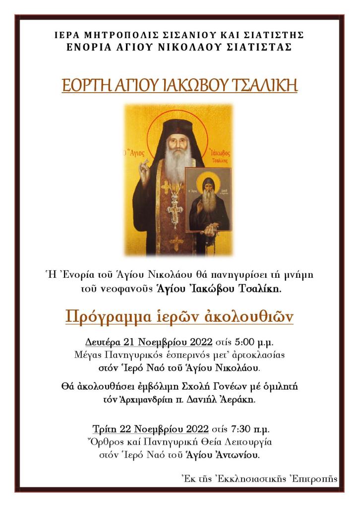 Η Ενορία του Αγίου Νικολάου Σιάτιστας πανηγυρίζει τη μνήμη του Αγίου Ιακώβου Τσαλίκη και εμβόλιμη Σχολή Γονέων με τον Αρχιμανδρίτη π. Δανιήλ Αεράκη.