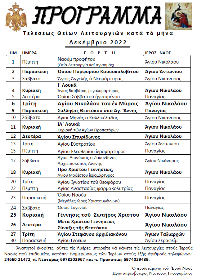 Πρόγραμμα Θείων Λειτουργιών Δεκεμβρίου 2022