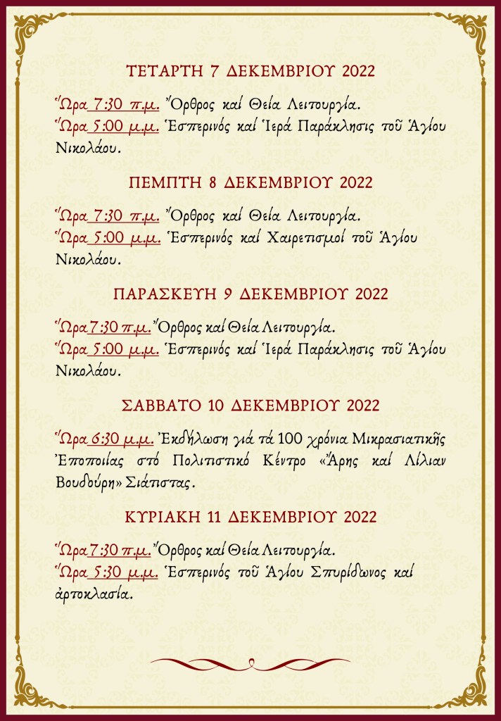 Εορτή Αγίου Νικολάου του θαυματουργού. Πρόγραμμα εορταστικών εκδηλώσεων.