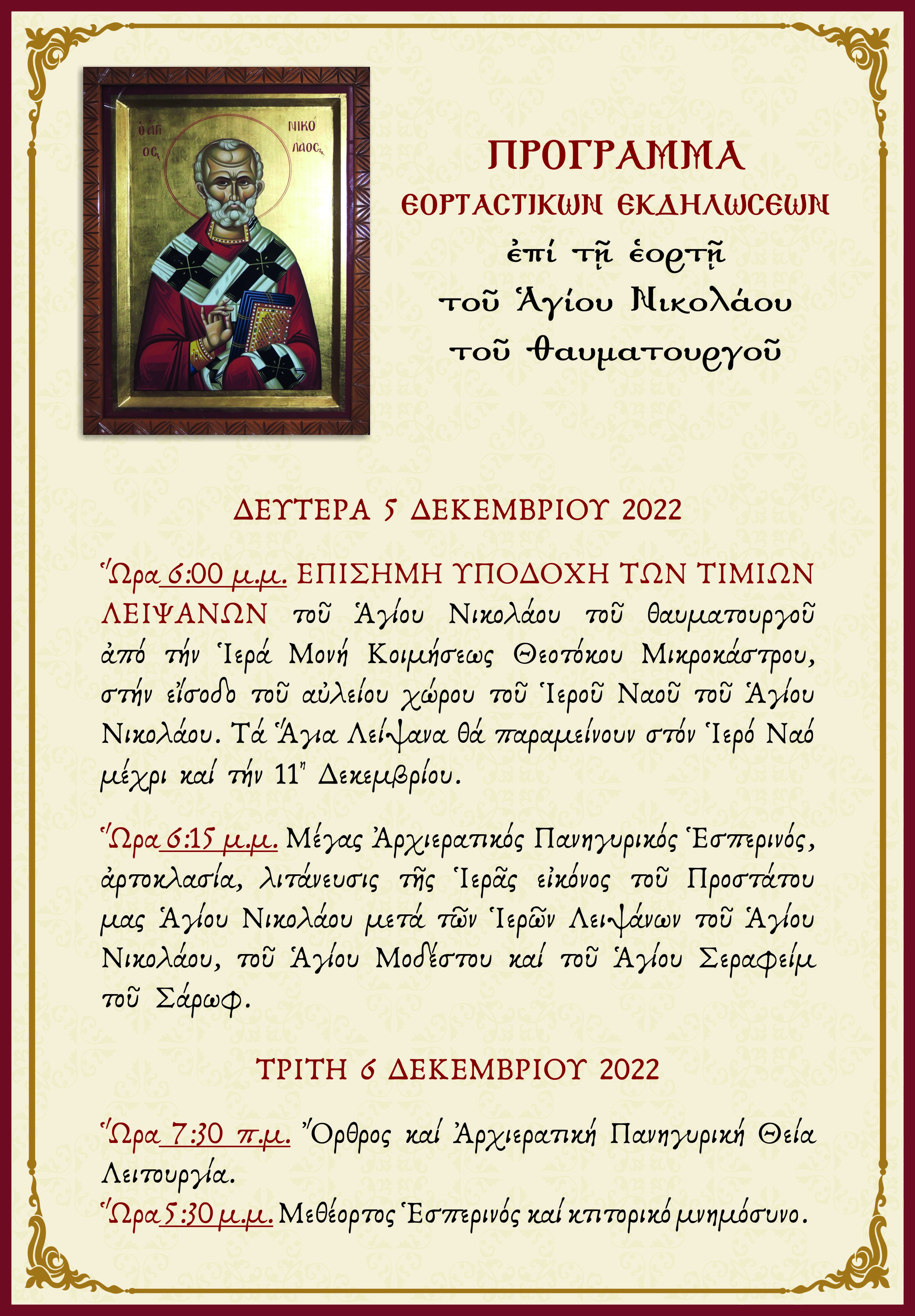 Εορτή Αγίου Νικολάου του θαυματουργού. Πρόγραμμα εορταστικών εκδηλώσεων.