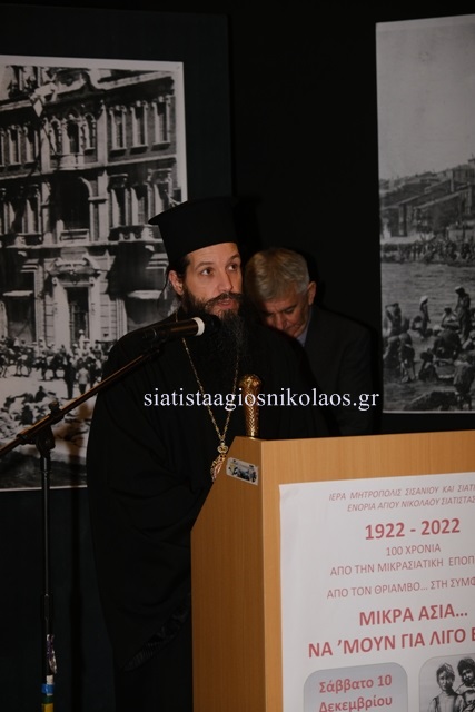 Η Ενορία του Αγίου Νικολάου Σιάτιστας, στα πλαίσια του Δεκαήμερου εορτασμού του Αγίου της, στις 10 Δεκεμβρίου 2022 στο Πολιτιστικό Κέντρο «Άρης και Λίλιαν Βουδούρη» διοργάνωσε Εκδήλωση Μνήμης, για τη συμπλήρωση 100 χρόνων από το τέλος της Μικρασιατικής Εκστρατείας.