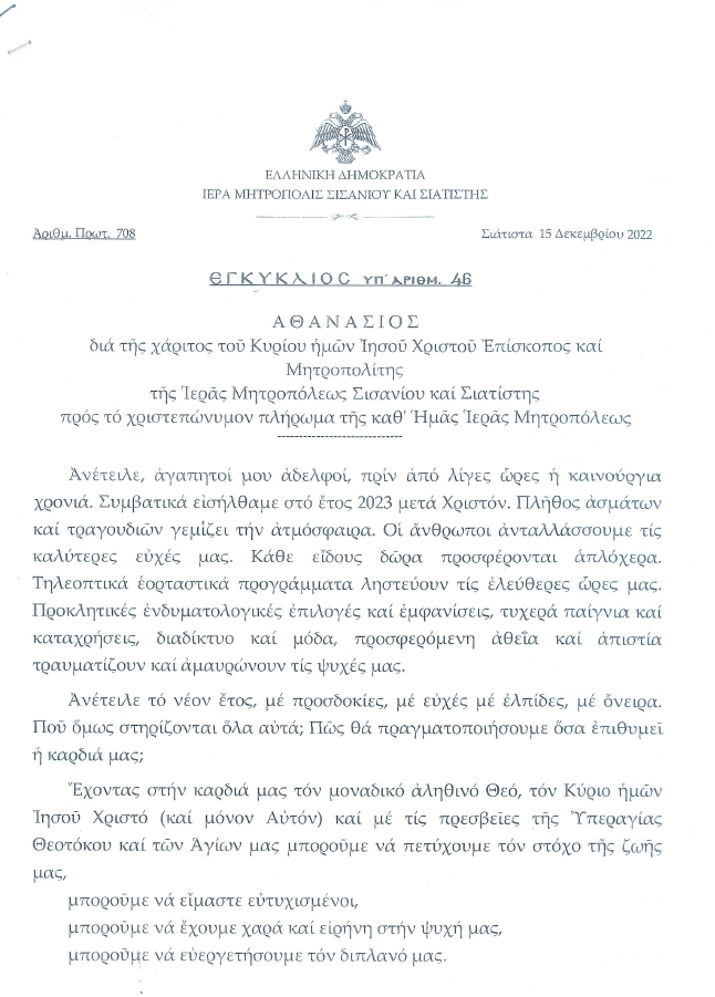 Εγκύκλιος του Σεβασμιωτάτου Μητροπολίτου Σισανίου και Σιατίστης κ.κ. Αθανασίου επί τη πρώτη του Νέου Έτους 2023.