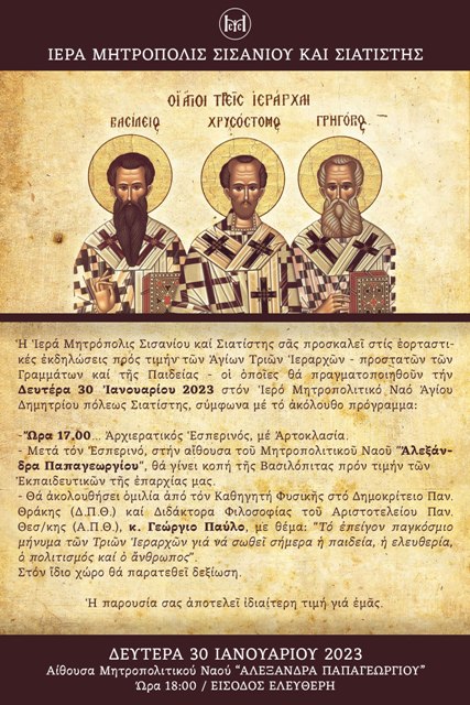Εκδήλωση προς τιμήν των Αγίων Τριών Ιεραρχών προστάτες των Γραμμάτων και της Παιδείας.