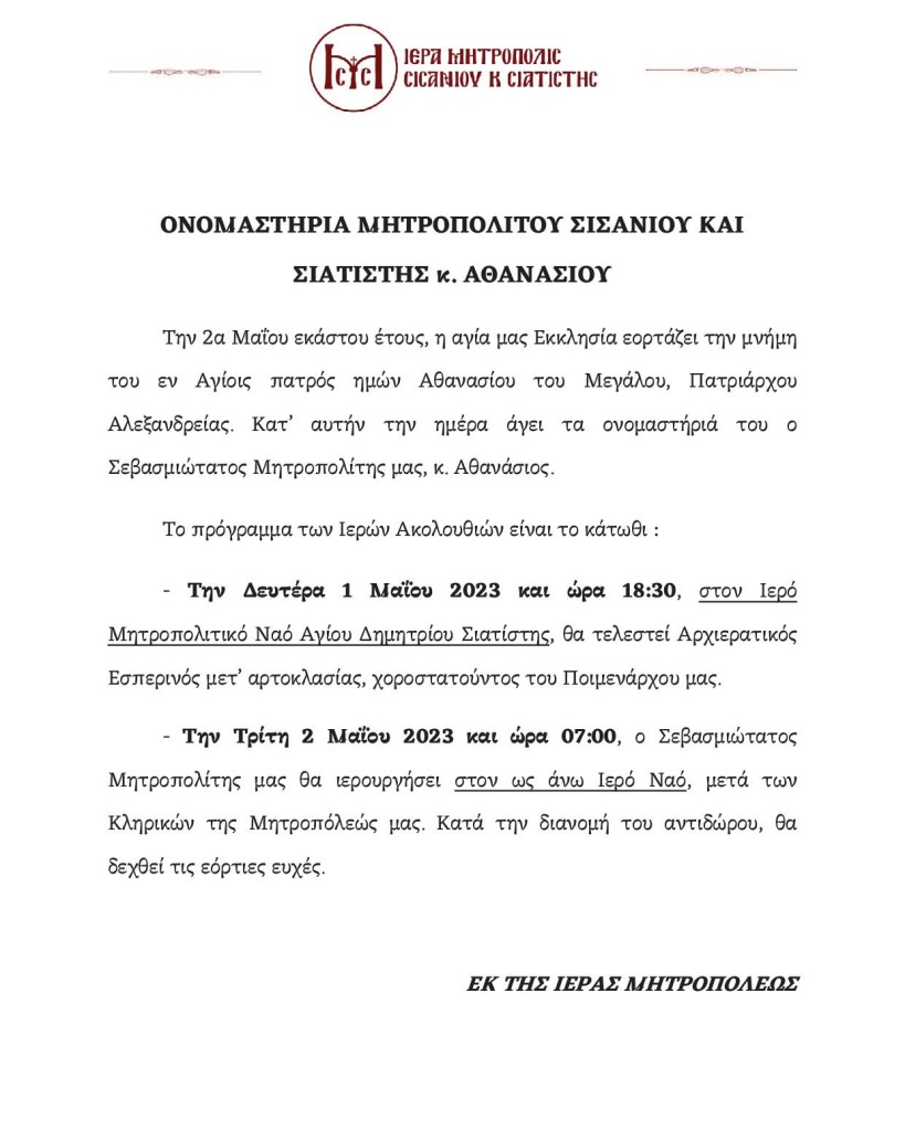 Τα Ονομαστήρια του Σεβασμιωτάτου Μητροπολίτου Σισανίου και Σιατίστης κ.κ. Αθανασίου.