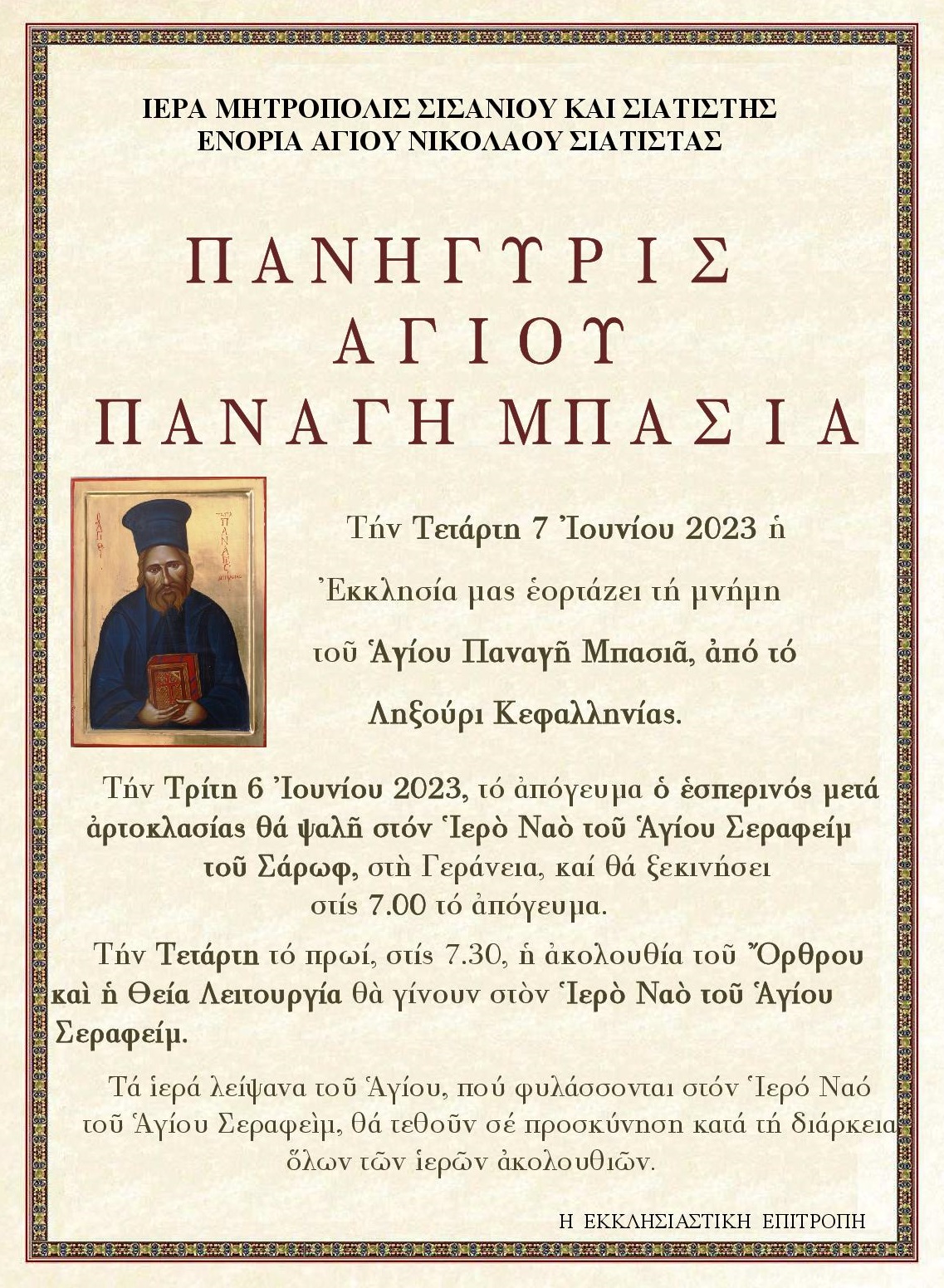 Εορτή Αγίου Παναγή Μπασιά από το Ληξούρι Κεφαλληνίας στην Ενορία του Αγίου Νικολάου Σιάτιστας.