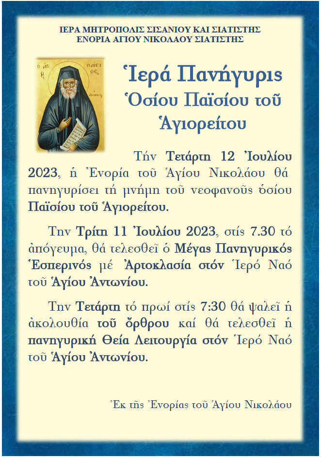 Ἱερά Πανήγυρις Ὁσίου Παϊσίου τοῦ Ἁγιορείτου στήν Ἐνορία τοῦ Ἁγίου Νικολάου Σιάτιστας.