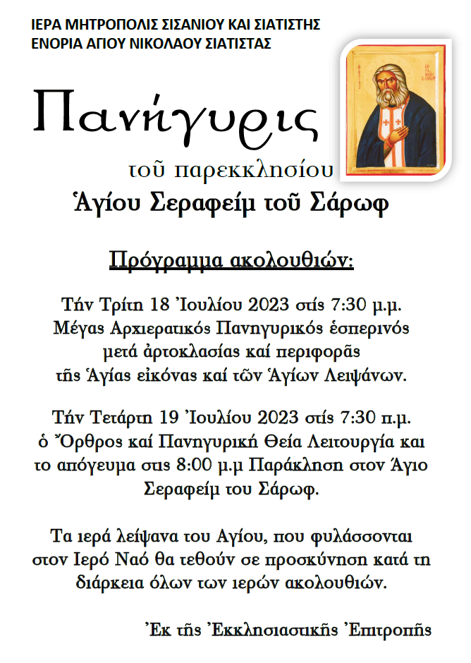 Πανήγυρις του παρεκκλησίου Αγίου Σεραφείμ του Σάρωφ προς τιμή της ανακομιδής των Λειψάνων του Αγίου στη Σιάτιστα.