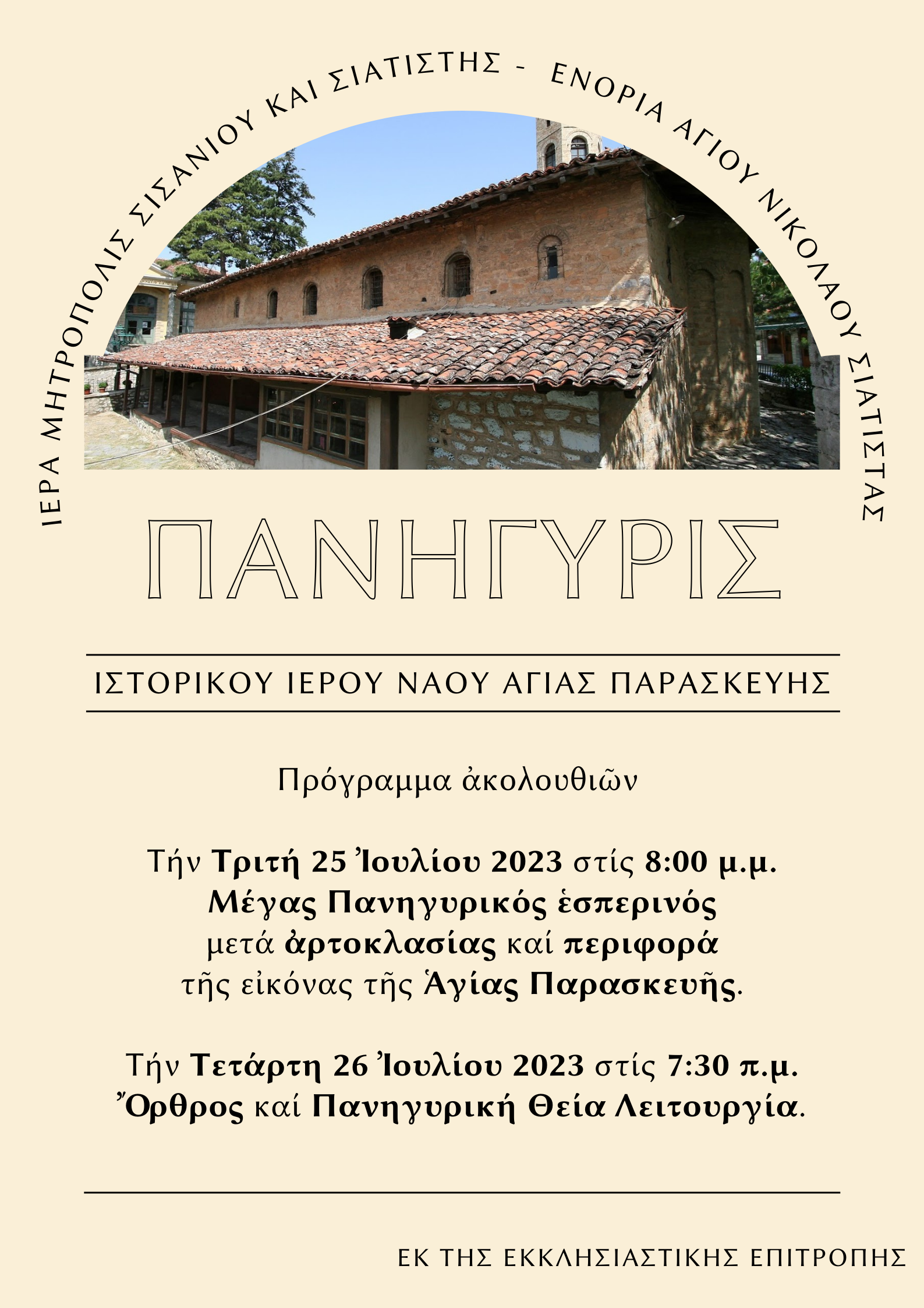Πανήγυρις Ιστορικού Ιερού Ναού Αγίας Παρασκευής.