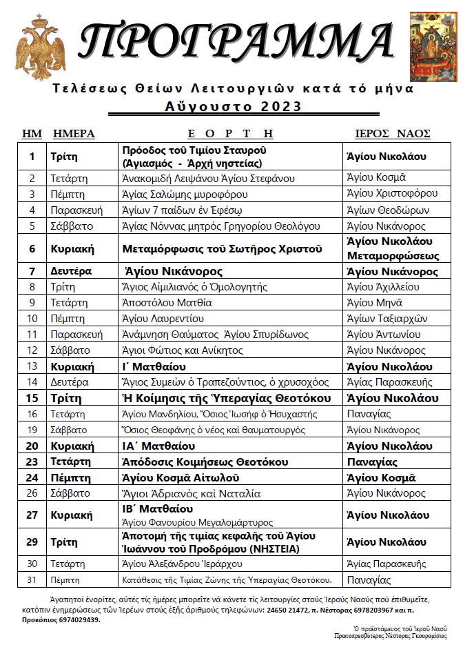 Πρόγραμμα Θείων Λειτουργιών Αυγούστου 2023