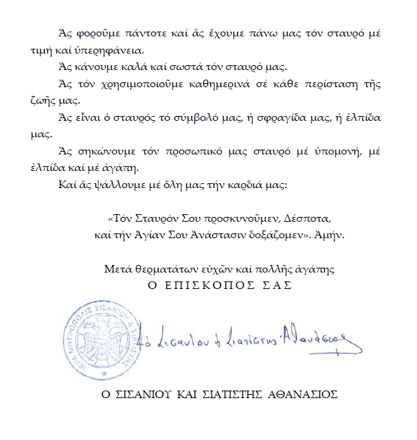 Ἐγκύκλιος ἐπὶ τῇ ἑορτὴ τῆς Ὑψώσεως τοῦ Τιμίου καὶ Ζωοποιοῦ Σταυροῦ τοῦ Σεβασμιωτάτου Μητροπολίτου Σισανίου καὶ Σιατίστης κ.κ. Ἀθανασίου.