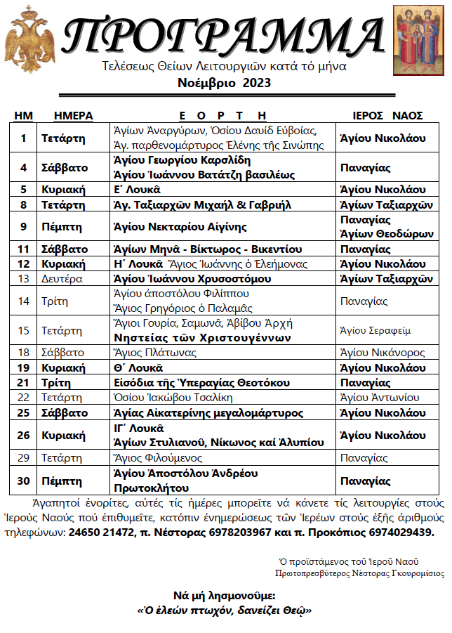 Πρόγραμμα Θείων Λειτουργιών Νοεμβρίου 2023