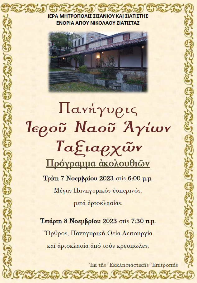 • Πανήγυρις Ιερού Ναού Αγίων Ταξιαρχών στην ενορία του Αγίου Νικολάου Σιάτιστας.